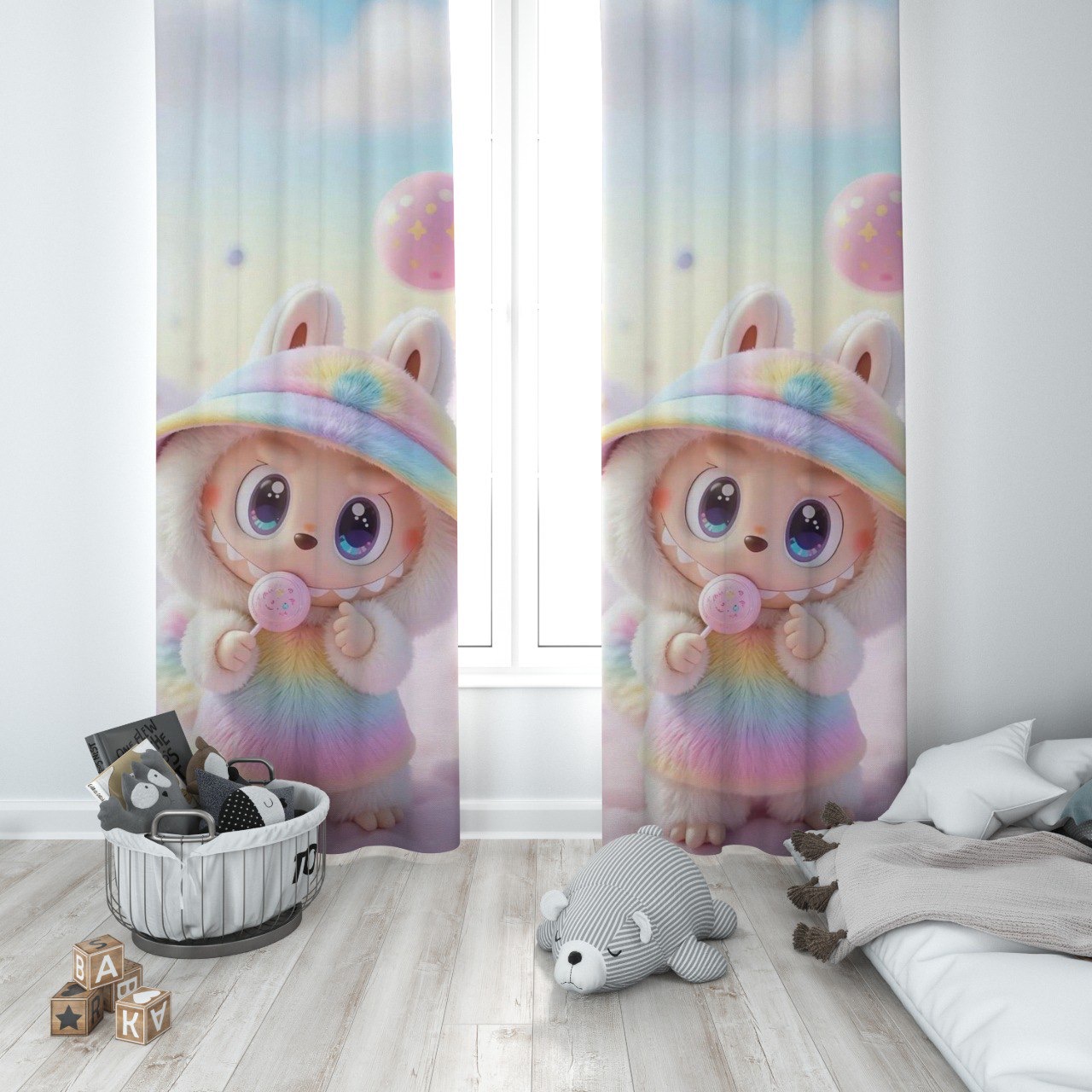 پرده پانچی دخترانه سه بعدی طرح لبوبو صورتی