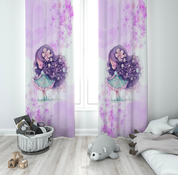 پرده پانچی دخترانه بنفش طرح دختر موفرفری بنفش